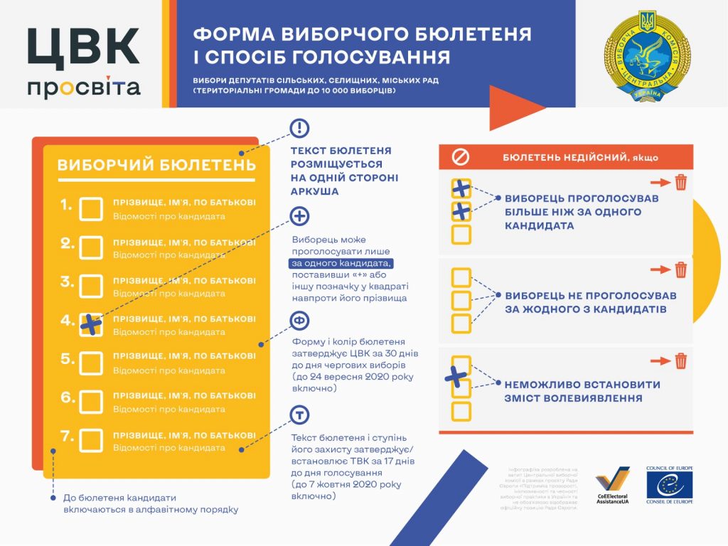 Праворуч від порядкового номера та прізвища кожного кандидата розміщується порожній квадрат. Виборець може проголосувати лише за одного кандидата на посаду сільського, селищного, міського голови, поставивши позначку «плюс» (+) або іншу в квадраті навпроти прізвища кандидата, за якого голосує.