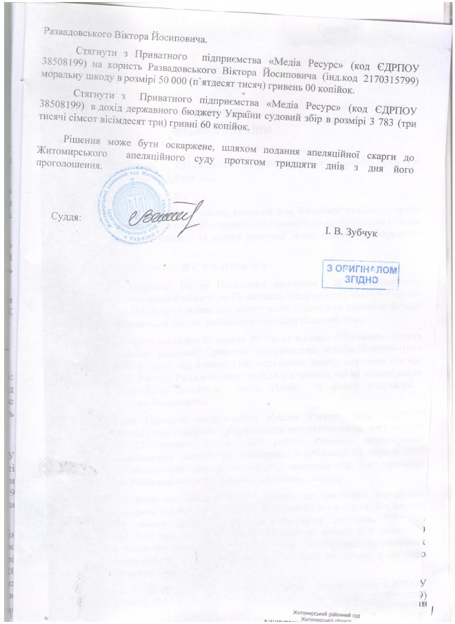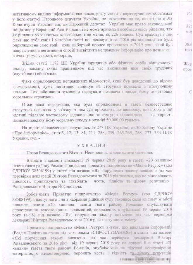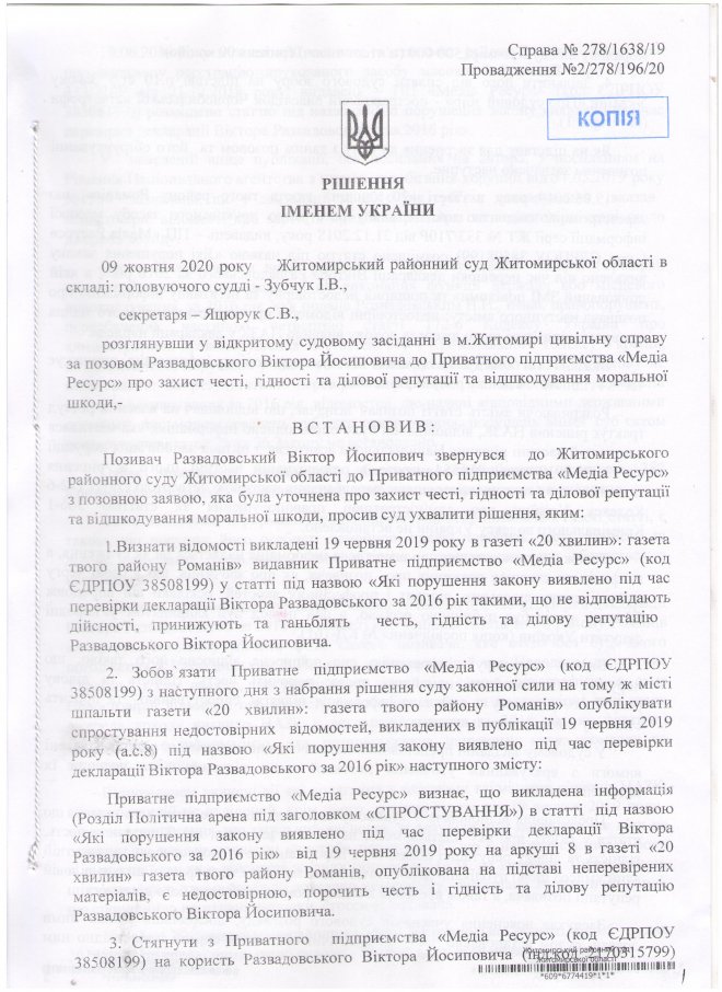 Таке рішення прийняв Житомирський районний суд 9 жовтня 2020 року, розглянувши у відкритому судовому засіданні справу за позовом Развадовського Віктора Йосиповича до газети «20 хвилин: газета твого району Романів» (видавник приватне підприємство «Медіа ресурс») про захист честі, гідності та ділової репутації та відшкодування моральної шкоди.