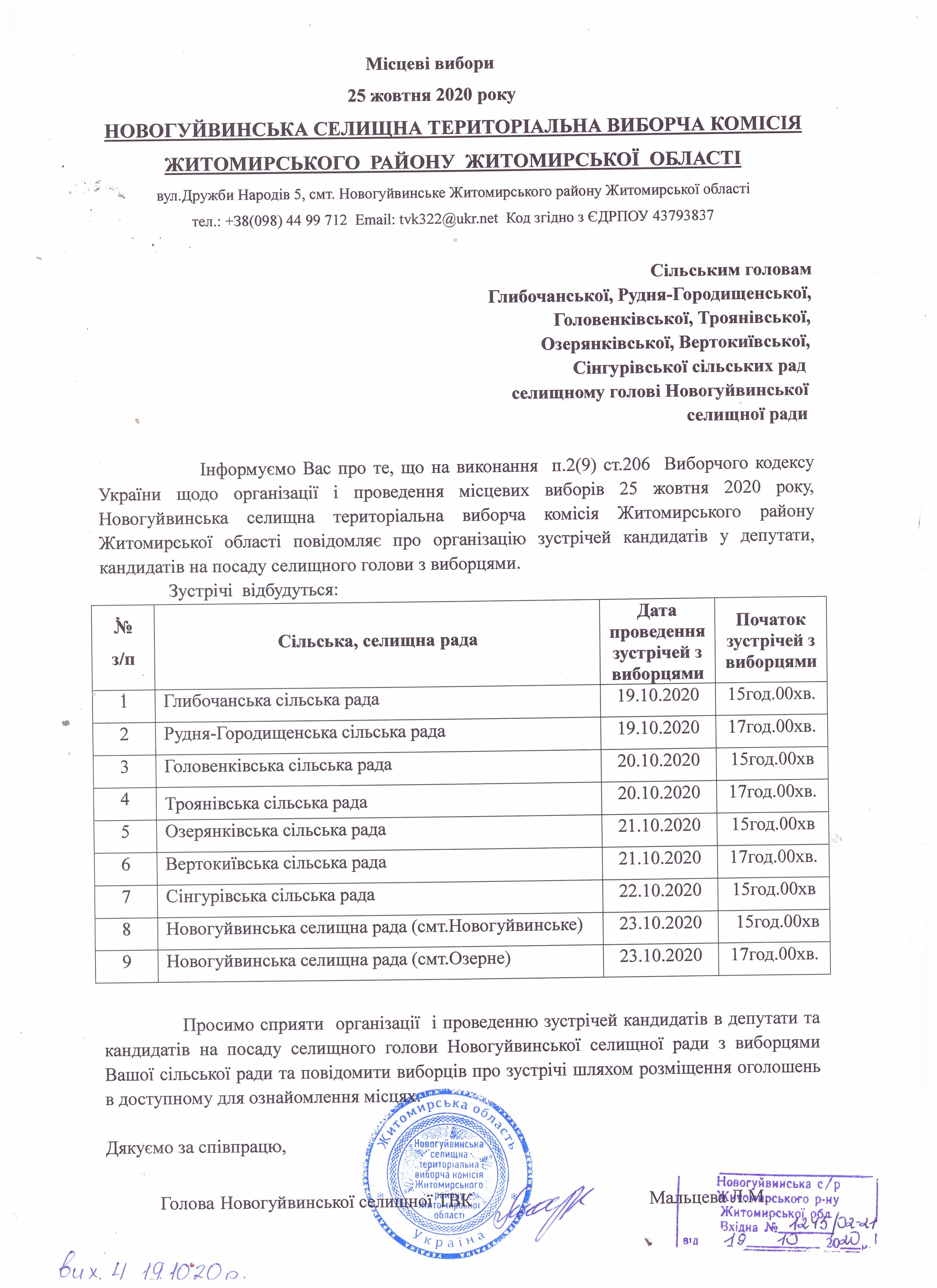 Новогуйвинська селищна ТВК інформує Новогуйвинська селищна рада 19-10-2020 17:20 Новина з сайту: Новогуйвинська селищна рада Джерело Поділитись дописом Опубліковано в Новогуйвинська селищна рада Prostir EU Читайте також з поточної категорії Новогуйвинська селищна радаВсе в категорії Новогуйвинська селищна рада »До уваги мешканців!До уваги мешканців!Звернення секретаря селищної ради до жителів громадиЗвернення секретаря селищної ради до жителів громадиПро початок процедури проведення громадських слухань щодо врахування громадських інтересів під час розроблення ДП території для реконструкції житлової квартири під приміщення аптеки за адресою: вул. Авіаційна, буд. 41, кв. 50, смт ОзернеПро початок процедури проведення громадських слухань щодо врахування громадських інтересів під час розроблення ДП території для реконструкції житлової квартири під приміщення аптеки за адресою: вул. Авіаційна, буд. 41, кв. 50, смт ОзернеПро початок процедури проведення громадських слухань щодо врахування громадських інтересів під час корегування детального плану території, що розроблений в с. Двірець по вул. Молодіжній Житомирського району Житомирської області, щодо території земельПро початок процедури проведення громадських слухань щодо врахування громадських інтересів під час корегування детального плану території, що розроблений в с. Двірець по вул. Молодіжній Житомирського району Житомирської області, щодо території земель