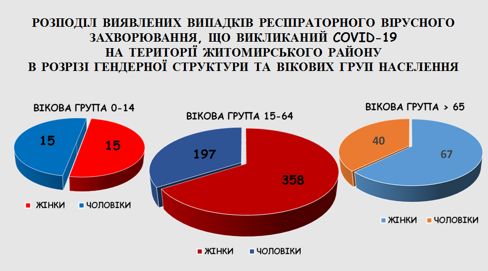 За період спостереження (з квітня 2020 року), станом на ранок 19 жовтня, у Житомирському районі зафіксовано 690 випадків захворювання на коронавірусну хворобу COVID-19. З яких 96 медичних працівників.