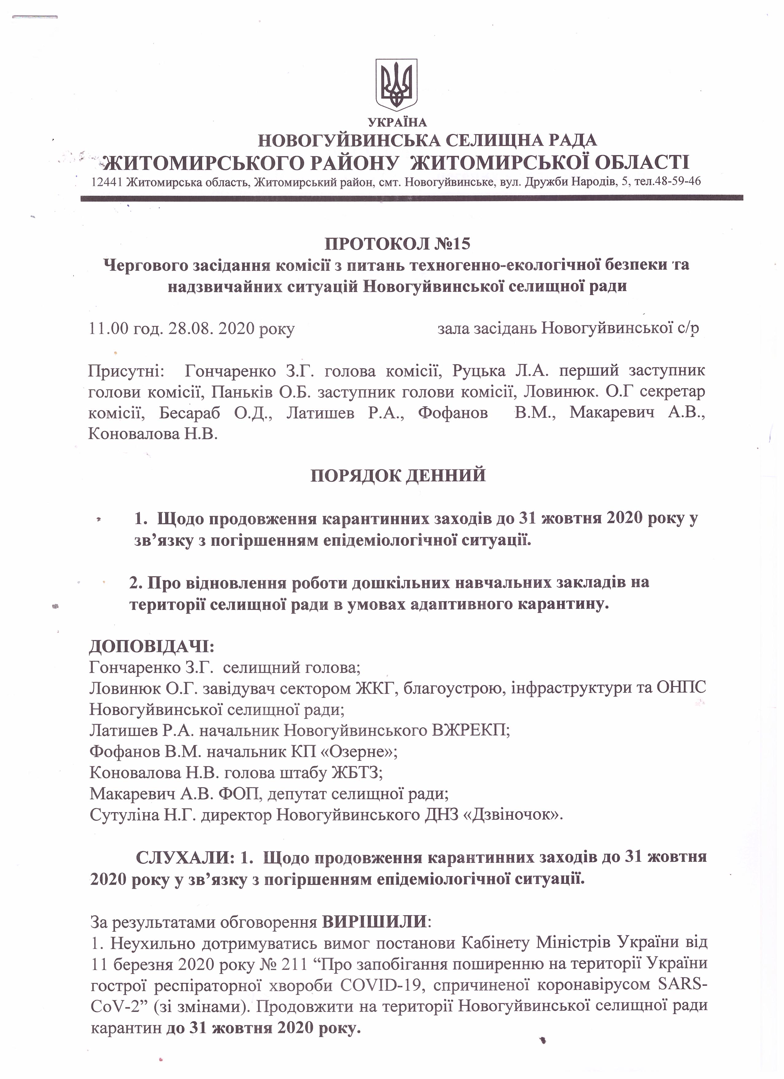 ПРОТОКОЛ №15 чергового засідання комісії з питань техногенно-екологічної безпеки та надзвичайних ситуацій Новогуйвинської селищної ради Новогуйвинська селищна рада 22-10-2020 15:20 Новина з сайту: Новогуйвинська селищна рада Джерело Поділитись дописом Опубліковано в Новогуйвинська селищна рада Prostir EU Читайте також з поточної категорії Новогуйвинська селищна радаВсе в категорії Новогуйвинська селищна рада »До уваги мешканців!До уваги мешканців!Звернення секретаря селищної ради до жителів громадиЗвернення секретаря селищної ради до жителів громадиПро початок процедури проведення громадських слухань щодо врахування громадських інтересів під час розроблення ДП території для реконструкції житлової квартири під приміщення аптеки за адресою: вул. Авіаційна, буд. 41, кв. 50, смт ОзернеПро початок процедури проведення громадських слухань щодо врахування громадських інтересів під час розроблення ДП території для реконструкції житлової квартири під приміщення аптеки за адресою: вул. Авіаційна, буд. 41, кв. 50, смт ОзернеПро початок процедури проведення громадських слухань щодо врахування громадських інтересів під час корегування детального плану території, що розроблений в с. Двірець по вул. Молодіжній Житомирського району Житомирської області, щодо території земельПро початок процедури проведення громадських слухань щодо врахування громадських інтересів під час корегування детального плану території, що розроблений в с. Двірець по вул. Молодіжній Житомирського району Житомирської області, щодо території земель