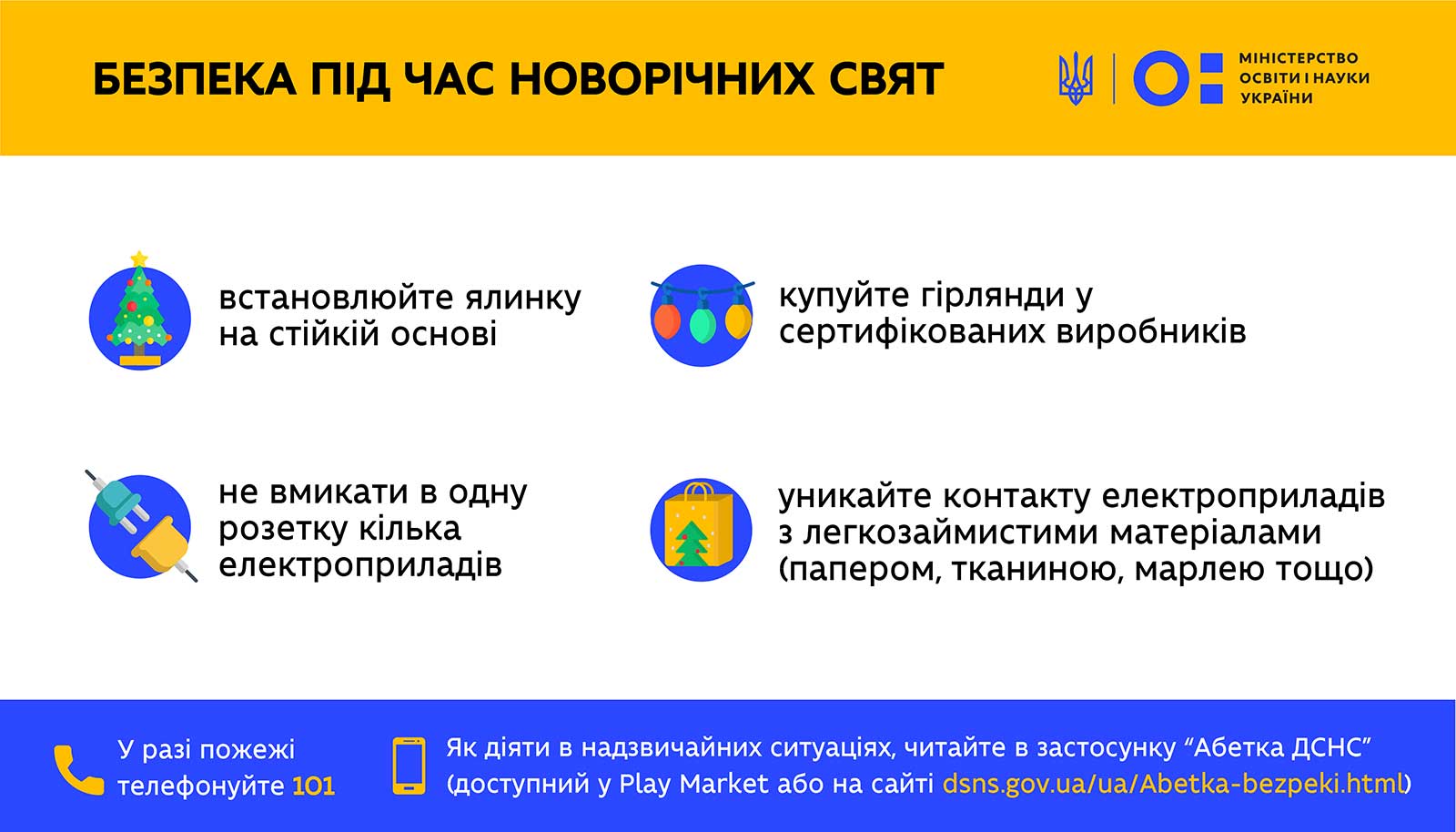 Серед основних порад: обережно поводитися з ялинкою та ялинковими прикрасами, уникати перевантаження розеток, не залишати без нагляду ввімкнені гірлянди та електроприлади. Також забороняється використовувати феєрверки, петарди та інші піротехнічні вироби.