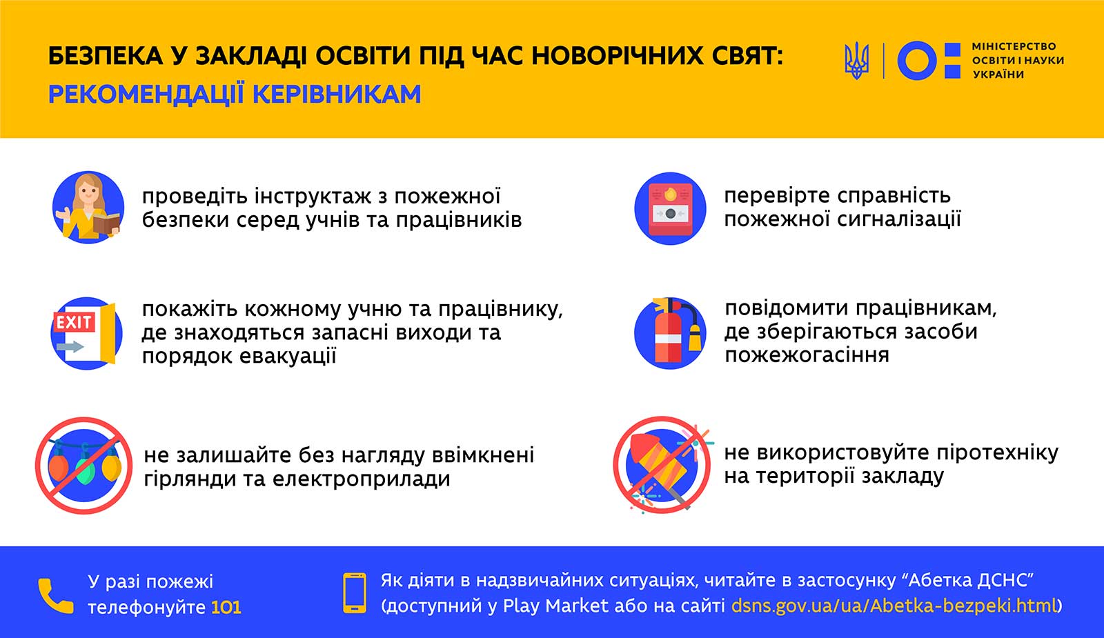 Упродовж грудня-січня заклади освіти мають особливо слідкувати за дотриманням правил безпеки. У період новорічних свят відбувається багато заходів та активностей, які підвищують ризик виникнення надзвичайних ситуацій. Міністерство освіти і науки України надає рекомендації щодо дотримання правил безпеки в цей час.