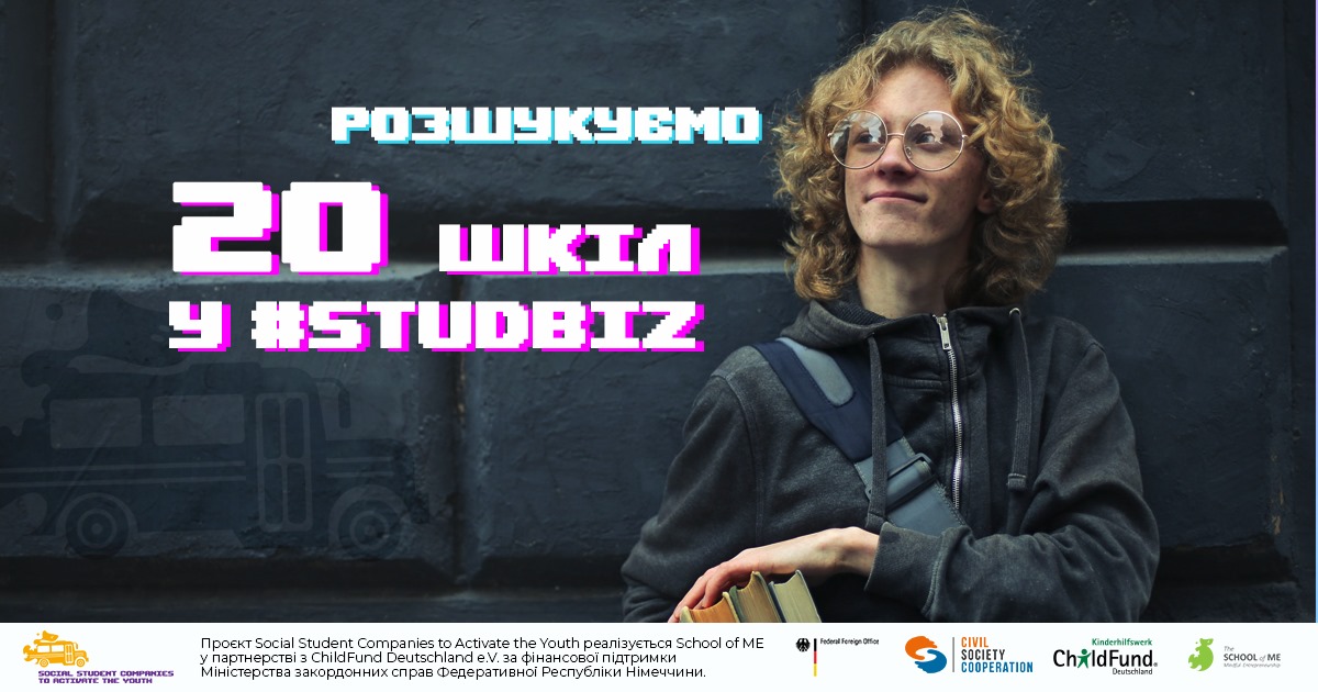 У рамках міжнародного проєкту Social Student Companies to Activate the Youth, реалізується School of ME у партнерстві з ChildFund Deutschland e.V. за фінансової підтримки Міністерства закордонних справ Федеративної Республіки Німеччини, буде відібрано 20 закладів освіти зі всієї України для проведення коротких тренінгів. На них ми разом з нашими партнерами допоможемо згенерувати ідеї для соціальних шкільних підприємств.