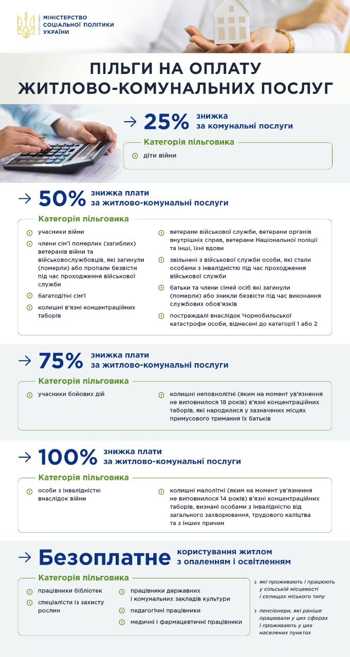 Міністр соціальної політики Марина Лазебна в ході форуму “Україна 30” поінформувала, що пільгами на послуги ЖКГ користуються 1,8 млн осіб, розмір знижки плати за послуги становить від 25% до 100% залежно від категорії пільговика.