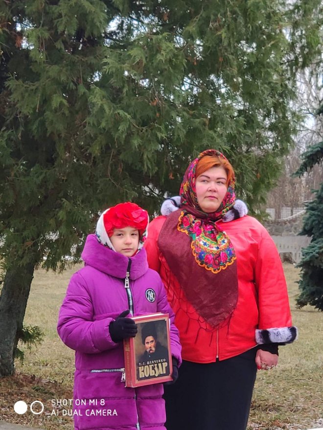 Декламуванням віршів та співом пісень на слова класика біля пам’ятника віддали шану Великому Кобзареві. Всіх присутніх вразила учениця 9 класу Пасечник Марія своєю грою на бандурі.