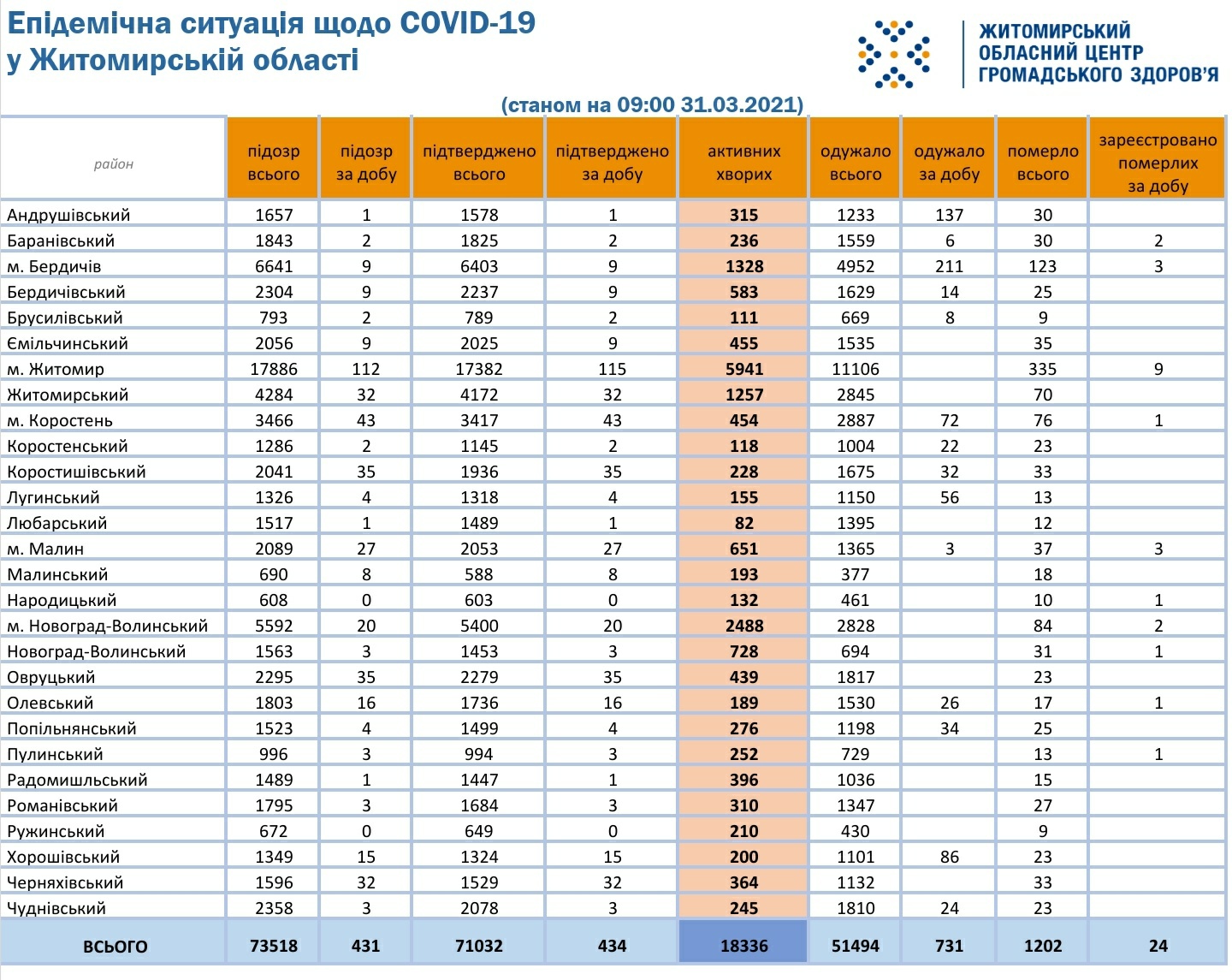 Станом на 09:00 31 березня 2021 року у Житомирській області виявлено 18 336 активних хворих на #COVID19.Протягом доби підтверджено 434 нових випадків, 731 людей одужали..