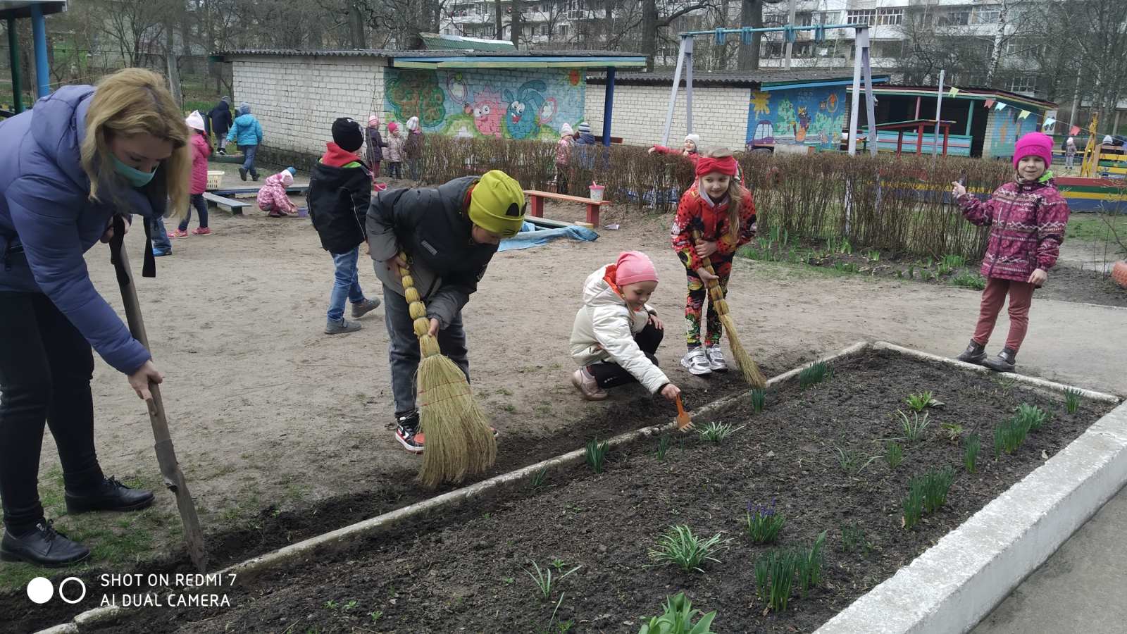 Колектив садочка прибрав територію та навкруги закладу: почистили кущі, облагородили клумби, городи та висадили різні види квітів, туї; побілили дерева. Обрізали сухі та аварійні гілки на деревах.