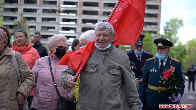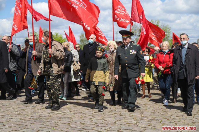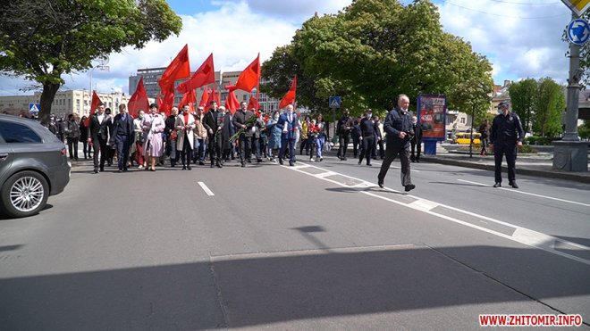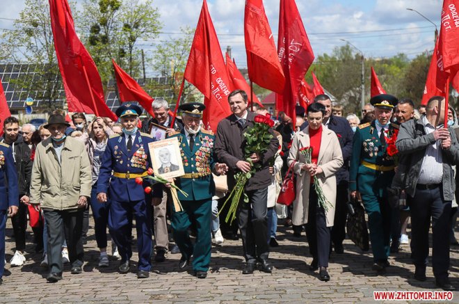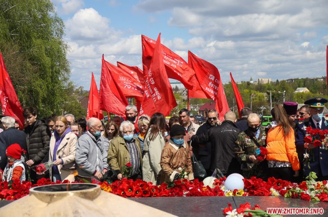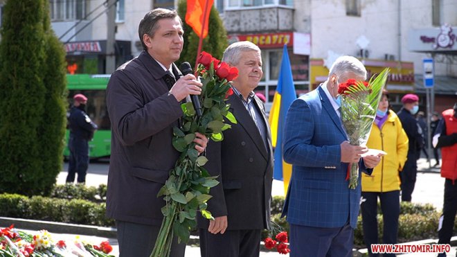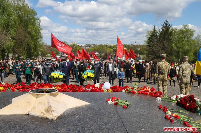 Урочистості розпочалися на площі Перемоги, де житомиряни разом з ветеранами війни, праці, Радянської Армії, представниками Компартії України, ОПЗЖ, депутатами міської та обласної рад поклали квіти до пам’ятника радянським воїнам-визволителям, які визволили Житомир від німецько-бандерівської окупації у 1943 році.