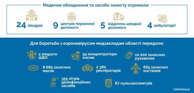 Благодійний фонд разом із засновником Володимиром Литвином відвідали 24 лікарні, які опікуються ковід-хворими, та 18 інших медичних закладів. Найбільшу частку допомоги становили кисневі концентратори, адже зі збільшенням кількості хворих потреба у них постійно зростала. Відтак, до лікарень області передали 56 концентраторів кисню та засоби індивідуального захисту. Зокрема, понад 10 тис. рукавичок, більше 9 тис. масок та майже 700 захисних костюмів.
