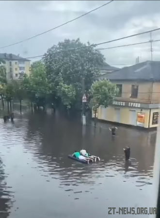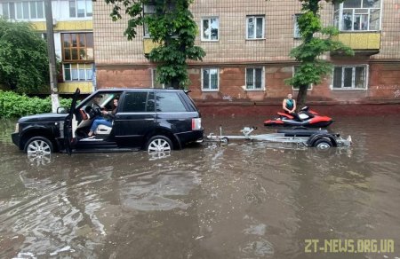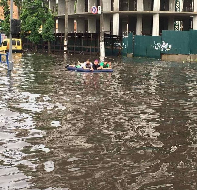 На вулиці Покровській, яку у Житомирі традиційно затоплює чи не найбільше, молодики розважалися на повну: каталися на водному мотоциклі, а потім і на надувному матраці. Чим вам не аквапарк? Смішно, звісно ж, але оскільки деякі вулиці Житомира, зокрема і Покровську, затоплює частенько під час зливи, стає сумно, особливо коли думаєш про людей, які якимось чином мають там пересуватися. До речі, наше видання раніше вже цікавилося питанням, чому рясні дощі перетворюють наше місто у велетеньку калюжу.