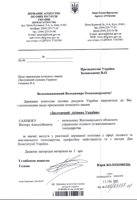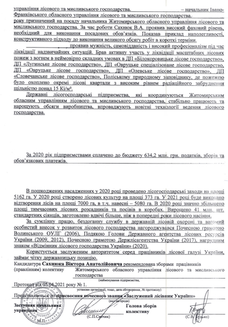Отже, оприлюднені документи та факти можуть переконливо говорити про відсутність достатніх і необхідних підстав для присвоєння почесного звання «Заслужений лісівник України» начальнику Житомирського обласного управління лісового та мисливського господарства Сахнюку Віктору.