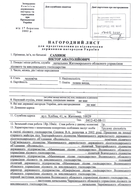 Нагородний лист для представлення до відзначення державними нагородами, форма якого затверджена Комісією державних нагород та геральдики при Президентові України від 17 березня 2003 року, у пункті 13 розкриває всію трагікомедію ситуації, детально розкриває за що саме Головний лісівник Житомирщини отримав відзнаку. У графі «Характеристика з зазначенням конкретних особливих заслуг особи» вказано усі особливі «заслуги», які, на думку лісівників Житомирщини, роблять їхнього начальника героєм, достойним державних відзнак.
