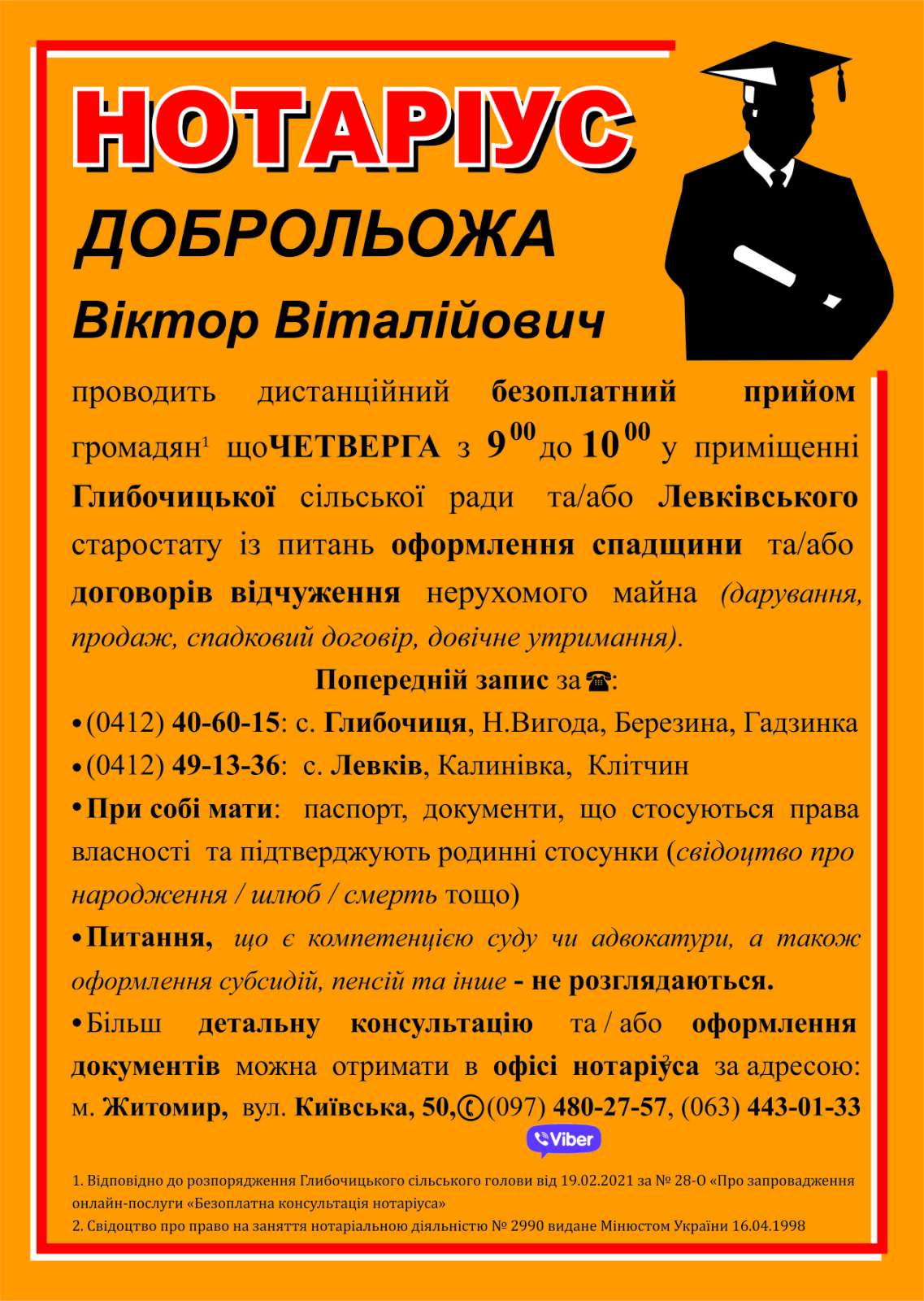 Зауважимо, що всі охочі отримати дистанційну безоплатну консультацію нотаріуса можуть це зробити щоЧЕТВЕРГА з 9  до 10 год. Більш детальну інформацію дивіться на оголошенні та/або запитуйте у вашому старостаті чи у сільській раді. Послуга надається за умови  дотримання протиепідемічних заходів (особам без ознак захворювання та за наявності маски/респиратора).