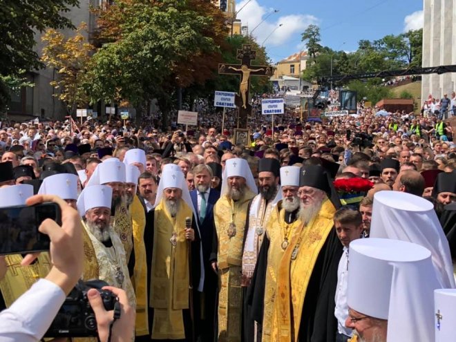 Молебень на Володимирській гірці в Києві очолив Предстоятель УПЦ Блаженніший Митрополит Київський і всієї України Онуфрій. Пряму трансляцію події вів телеканал «Інтер».