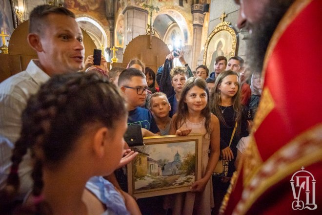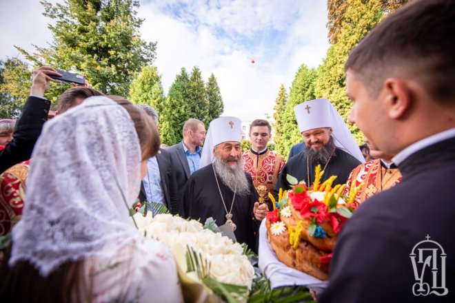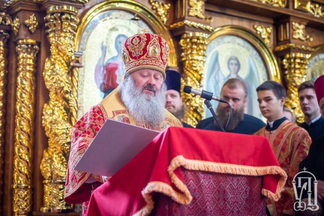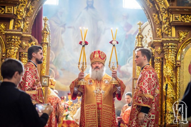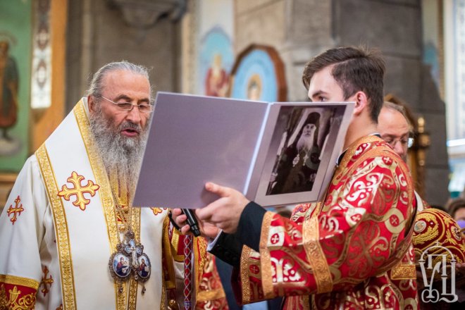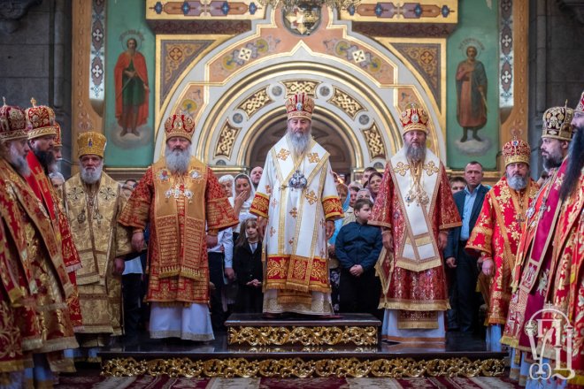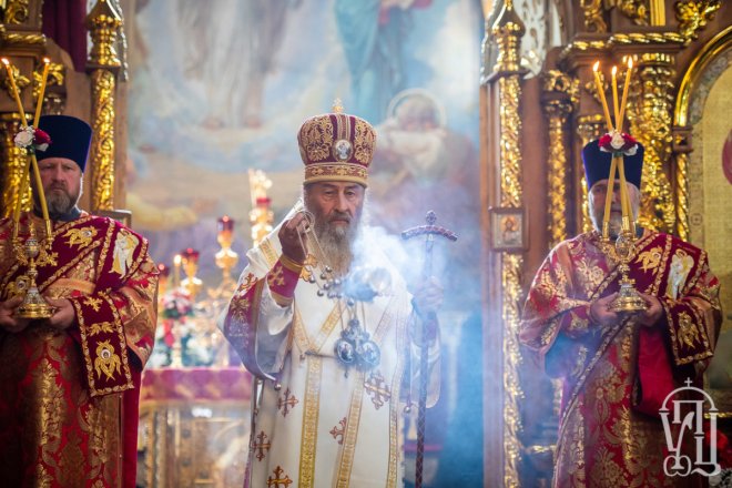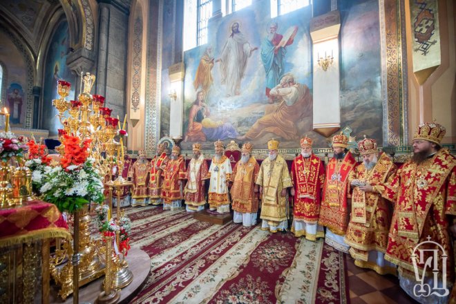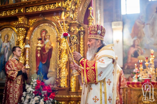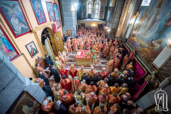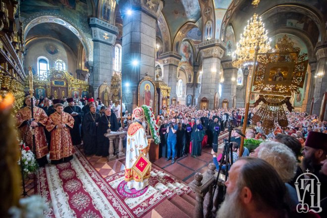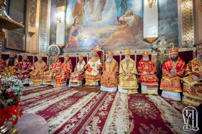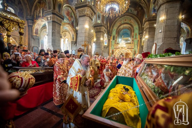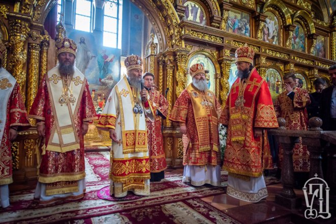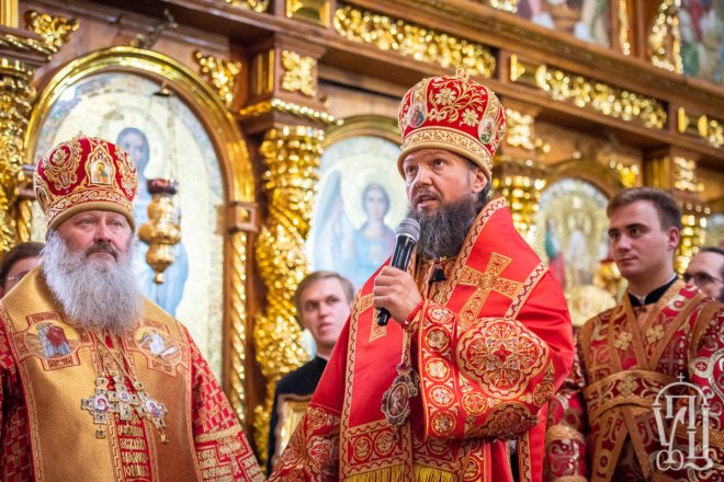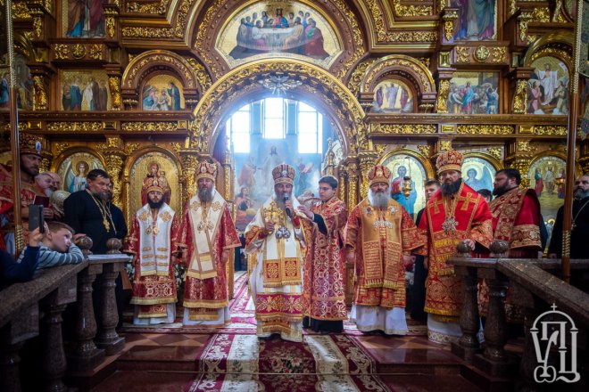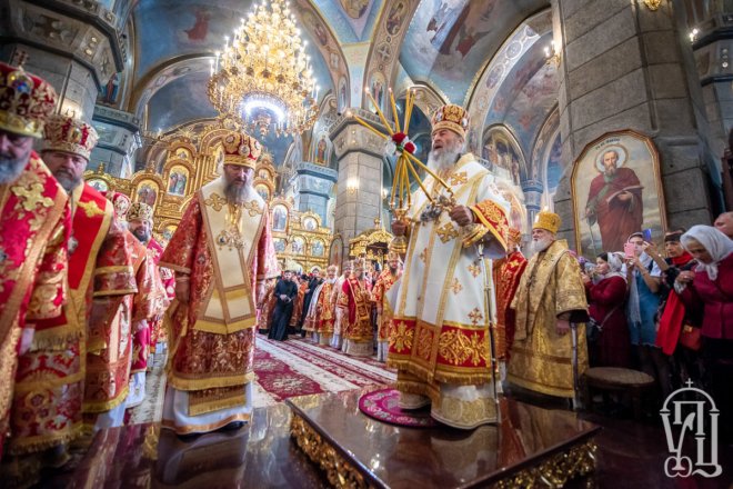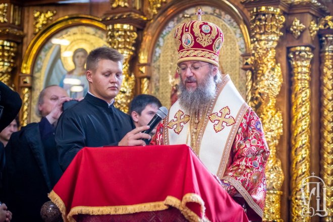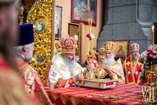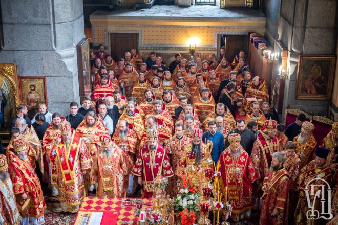 Предстоятелю співслужили митрополит Вишгородський і Чорнобильський Павел, керуючий справами УПЦ митрополит Бориспільський і Броварський Антоній, митрополит Овруцький і Коростенський Віссаріон, митрополит Херсонський і Таврійський Іоанн, митрополит Почаївський Володимир, митрополит Полтавський і Миргородський Филип, митрополит Житомирський і Новоград-Волинський Никодим, митрополит Володимир-Волинський і Ковельський Володимир, митрополит Уманський і Звенигородський Пантелеімон, митрополит Львівський і Галицький Філарет, митрополит Черкаський і Канівський Феодосій, митрополит Вінницький і Барський Варсонофій, архієпископ Гурій (Кузьменко), архієпископ Бучанський Пантелеімон, архієпископ Обухівський Іона, архієпископ Фастівський Даміан, єпископ Баришівський Віктор, єпископ Ладижинський Сергій, єпископ Бородянський Марк, єпископ Бишівський Кирил, духовенство собору, єпархії та гості у священному сані.