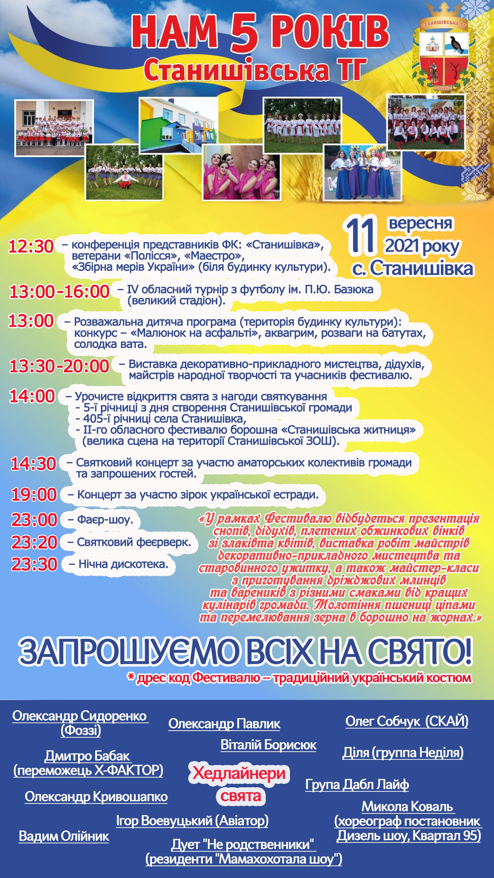 11 вересня 2021 року в Станишівській громаді відбудуться святкові заходи з нагоди відзначення 5-ї річниці створення Станишівської громади, 405-ї річниці села Станишівка та ІІ-му обласному фестивалі борошна «Станишівська житниця».