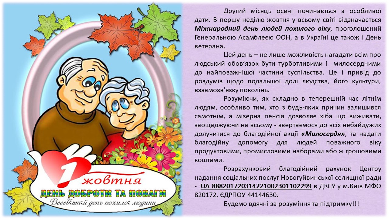 Турбота про людей похилого віку – справа всього суспільства, адже саме літні люди зберегли для нас найкращі національні традиції, навчили долати труднощі, бути наполегливими і толерантними. На долю старшого покоління випало чимало випробувань, болю і втрат, проте вони зуміли зберегти і пронести через життя почуття гідності, віри і любові.