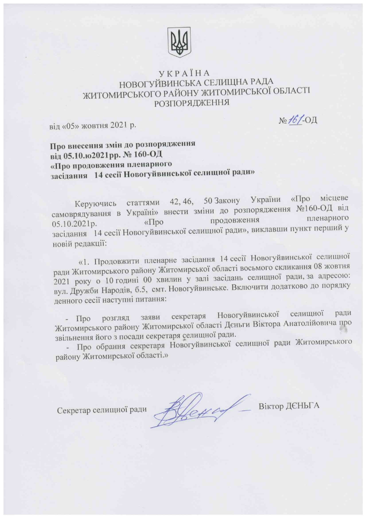 161-ОД Про внесення змін до розпорядження від 05.10.2021р. №160-ОД “Про продовження пленарного засідання 14 сесії Новогуйвинської селищної ради” Новогуйвинська селищна рада 05-10-2021 17:00 Новина з сайту: Новогуйвинська селищна рада Джерело Поділитись дописом Опубліковано в Новогуйвинська селищна рада Prostir EU Читайте також з поточної категорії Новогуйвинська селищна радаВсе в категорії Новогуйвинська селищна рада »До уваги мешканців!До уваги мешканців!Звернення секретаря селищної ради до жителів громадиЗвернення секретаря селищної ради до жителів громадиПро початок процедури проведення громадських слухань щодо врахування громадських інтересів під час розроблення ДП території для реконструкції житлової квартири під приміщення аптеки за адресою: вул. Авіаційна, буд. 41, кв. 50, смт ОзернеПро початок процедури проведення громадських слухань щодо врахування громадських інтересів під час розроблення ДП території для реконструкції житлової квартири під приміщення аптеки за адресою: вул. Авіаційна, буд. 41, кв. 50, смт ОзернеПро початок процедури проведення громадських слухань щодо врахування громадських інтересів під час корегування детального плану території, що розроблений в с. Двірець по вул. Молодіжній Житомирського району Житомирської області, щодо території земельПро початок процедури проведення громадських слухань щодо врахування громадських інтересів під час корегування детального плану території, що розроблений в с. Двірець по вул. Молодіжній Житомирського району Житомирської області, щодо території земель