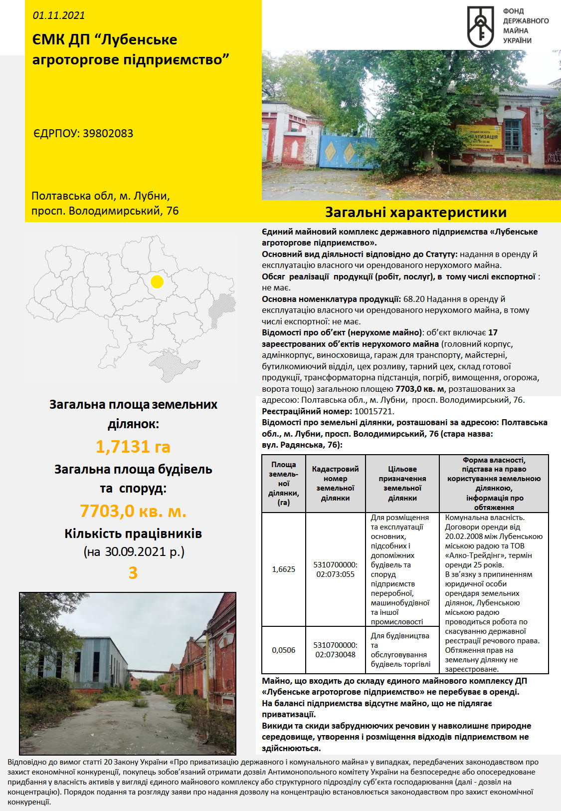На даний час Регіональним відділенням ФДМУ по Полтавській та Сумській областях оголошено проведення онлайн-аукціону з приватизації єдиного майнового комплексу державного підприємства «Лубенське агроторгове підприємство» зі стартовою ціною об’єкта приватизації 5365,666 тис. грн. Онлайн-аукціон з умовами продажу об’єкта відбудеться 26 листопада 2021 року, прийом заявок для участі в аукціоні триватиме до 25 листопада  2021 року.