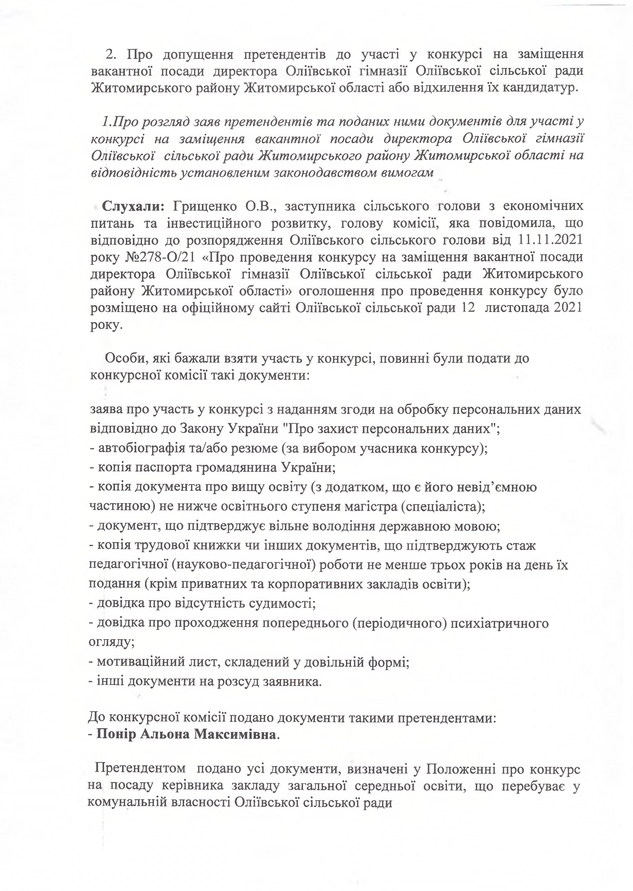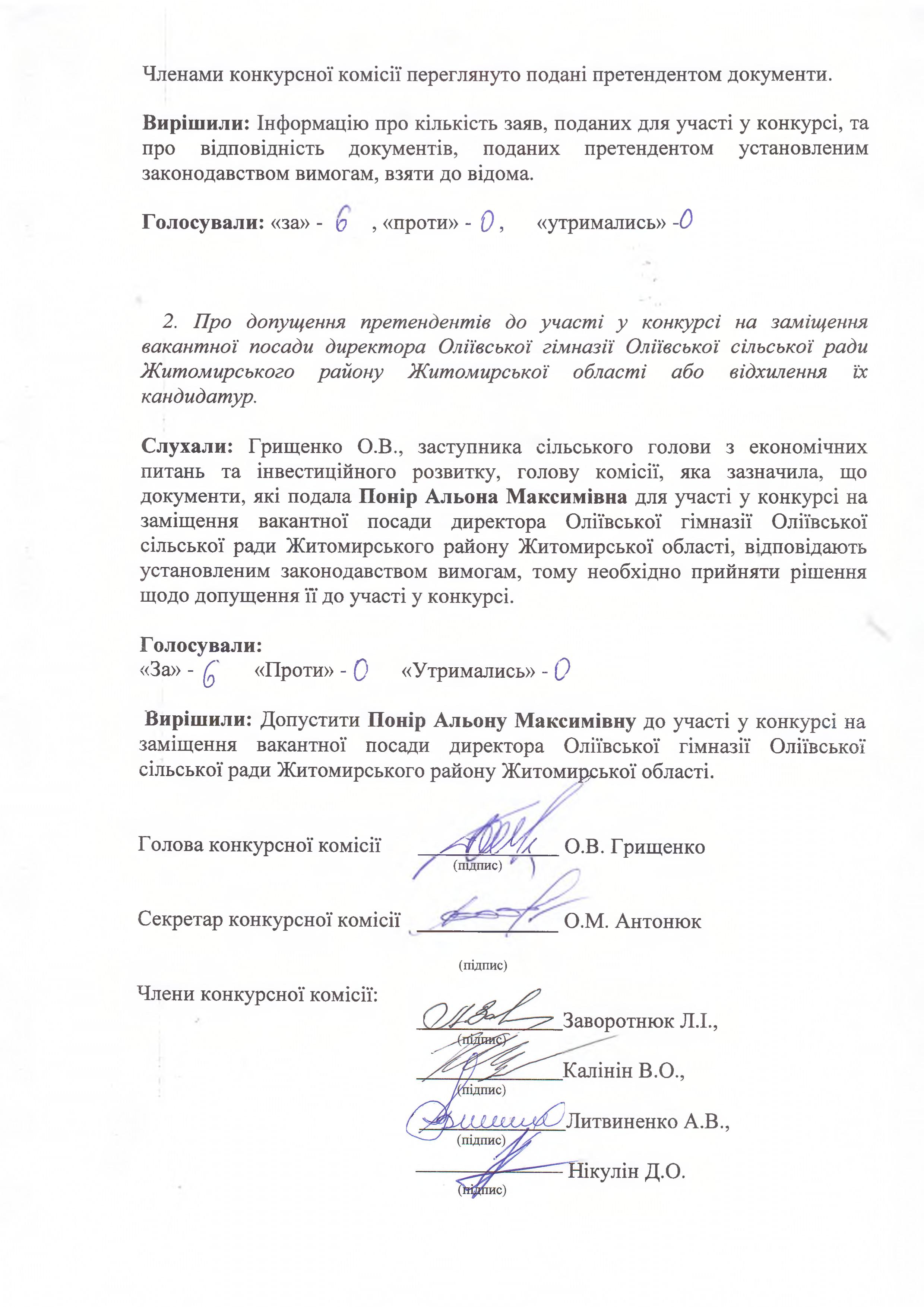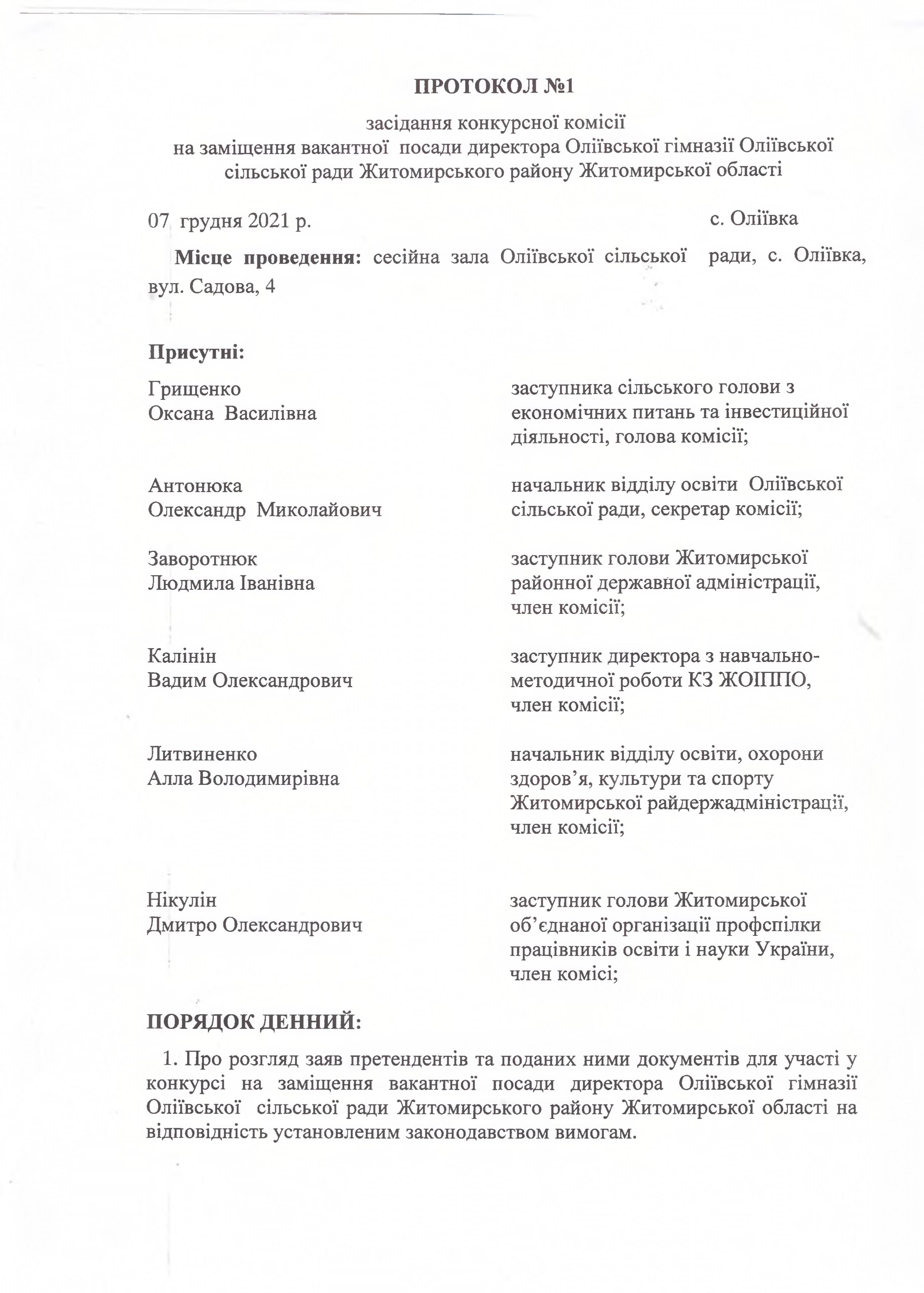 7 грудня відбулося засідання конкурсної комісії на заміщення вакантної посади директора Оліївської гімназії Оліївської сільської ради Житомирського району Житомирської області на якому розглянуто заяви претендентів та подані ними документи для участі на заміщення вакантної посади директора даного навчального закладу.