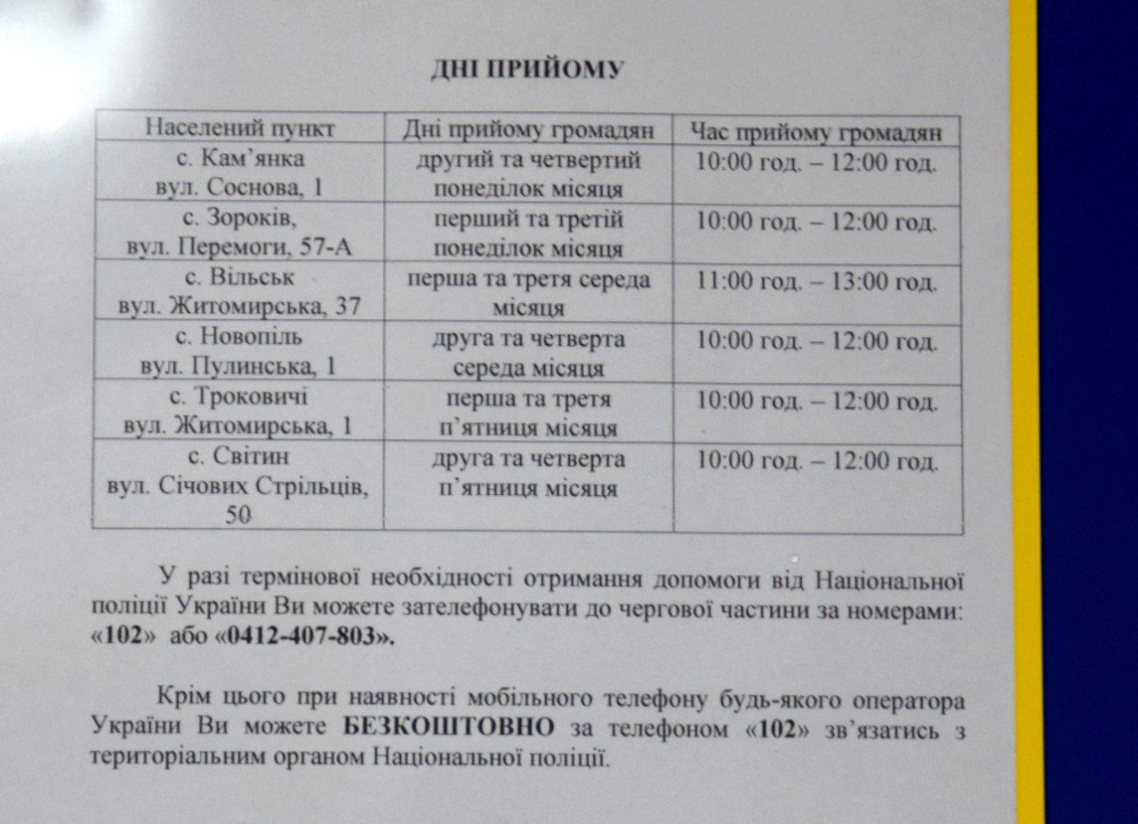 Нижче до Вашої уваги – графік прийому поліцейського офіцера громади. Номер телефону офіцера: 0973106513