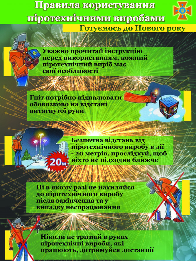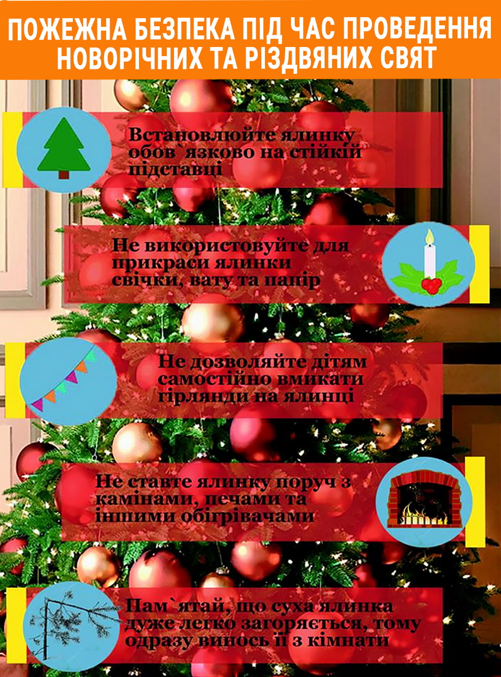 Пам’ятайте, що в приміщенні, де встановлена ялинка, необхідно обладнати протипожежний куточок, в якому мають бути вогнегасники, вода і спеціальні ковдри; виходи і проходи в цьому приміщенні повинні бути вільні.