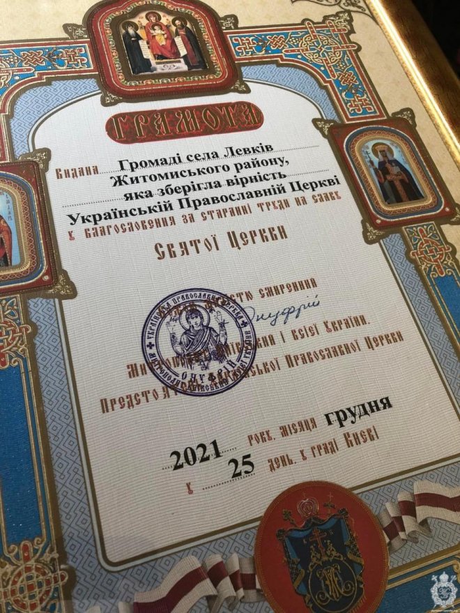 25 грудня 2021 року, в день пам’яті святителя Спиридона, єпископа Триміфунтського чудотворця, митрополит Житомирський і Новоград-Волинський Никодим звершив чин освячення храму на честь ікони Божої Матері «Скоропослушниця» в селі Левків Житомирського району.
