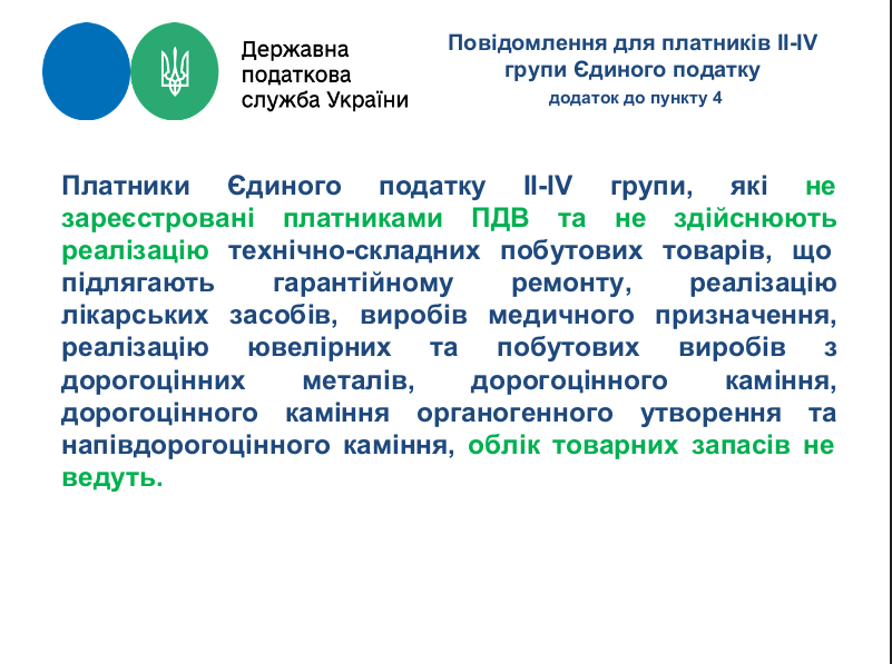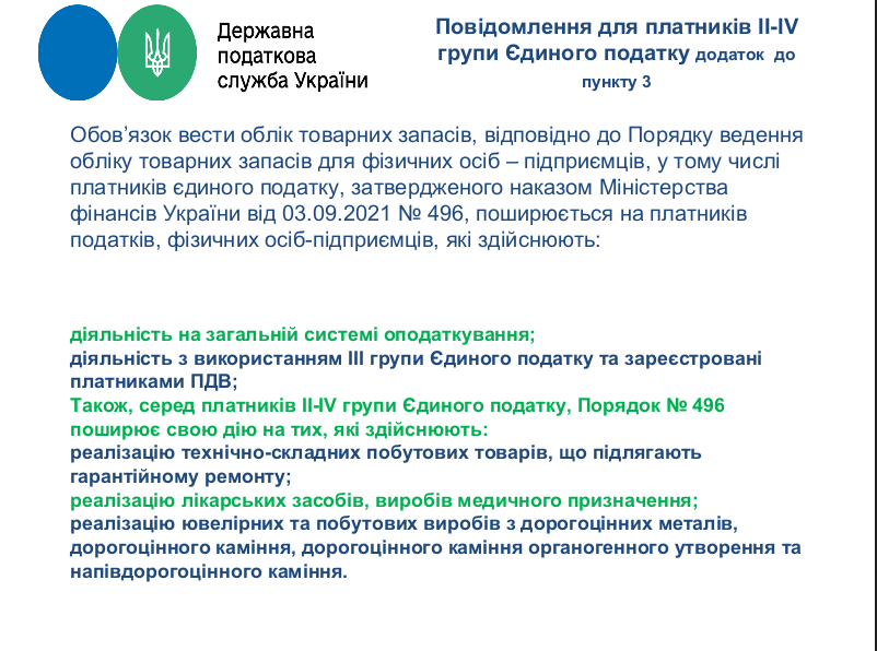 При цьому ФОП – платники єдиного податку, що здійснюють продаж технічно складних побутових товарів, що підлягають гарантійному ремонту, а також лікарських засобів та виробів медичного призначення, ювелірних та побутових виробів з дорогоцінних металів, дорогоцінного каміння, а також платники єдиного податку, які зареєстровані платниками ПДВ, зобов’язані вести облік товарних запасів, відповідно до вимог затвердженого Порядку ведення обліку товарних записів для фізичних осіб – підприємців, у тому числі платників єдиного податку, який затверджений наказом Мінфіну від 09.09.2021 №496.