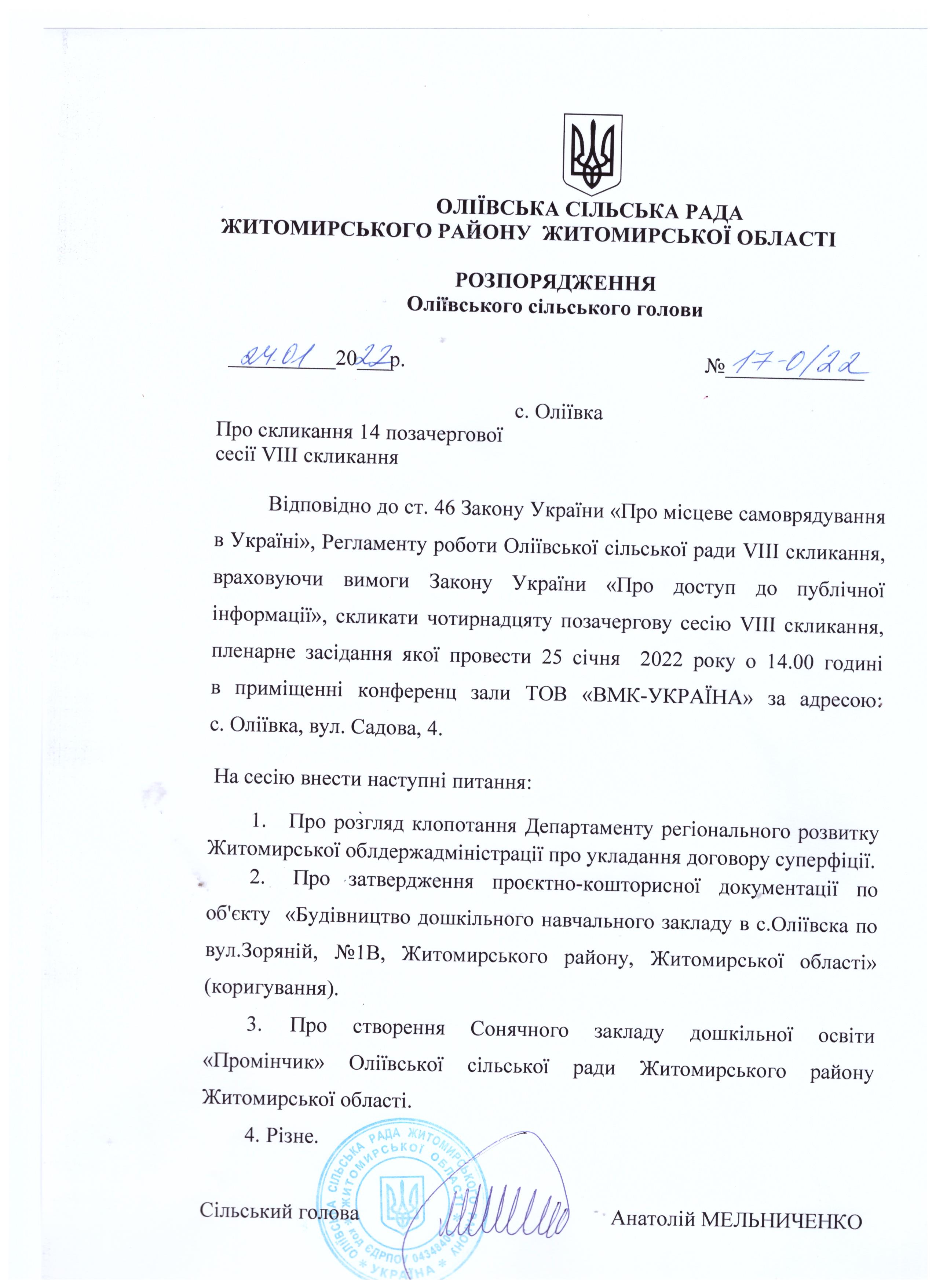 Розпорядженням Оліївського сільського голови від 24.01.2022р. № 17-0/22, відповідно до ст. 46 Закону України «Про місцеве самоврядування в Україні», Регламенту роботи Оліївської сільської ради 8 скликання, враховуючи вимоги Закону України «Про доступ до публічної інформації», скликається позачергова чотирнадцята сесія VIIІ скликання Оліївської сільської ради, пленарне засідання якої буде проведено 25 січня 2022 року о 14.00 в приміщенні конференц зали ТОВ «ВМК-УКРАЇНА» за адресою: с.Оліївка, вул.Садова, 4.