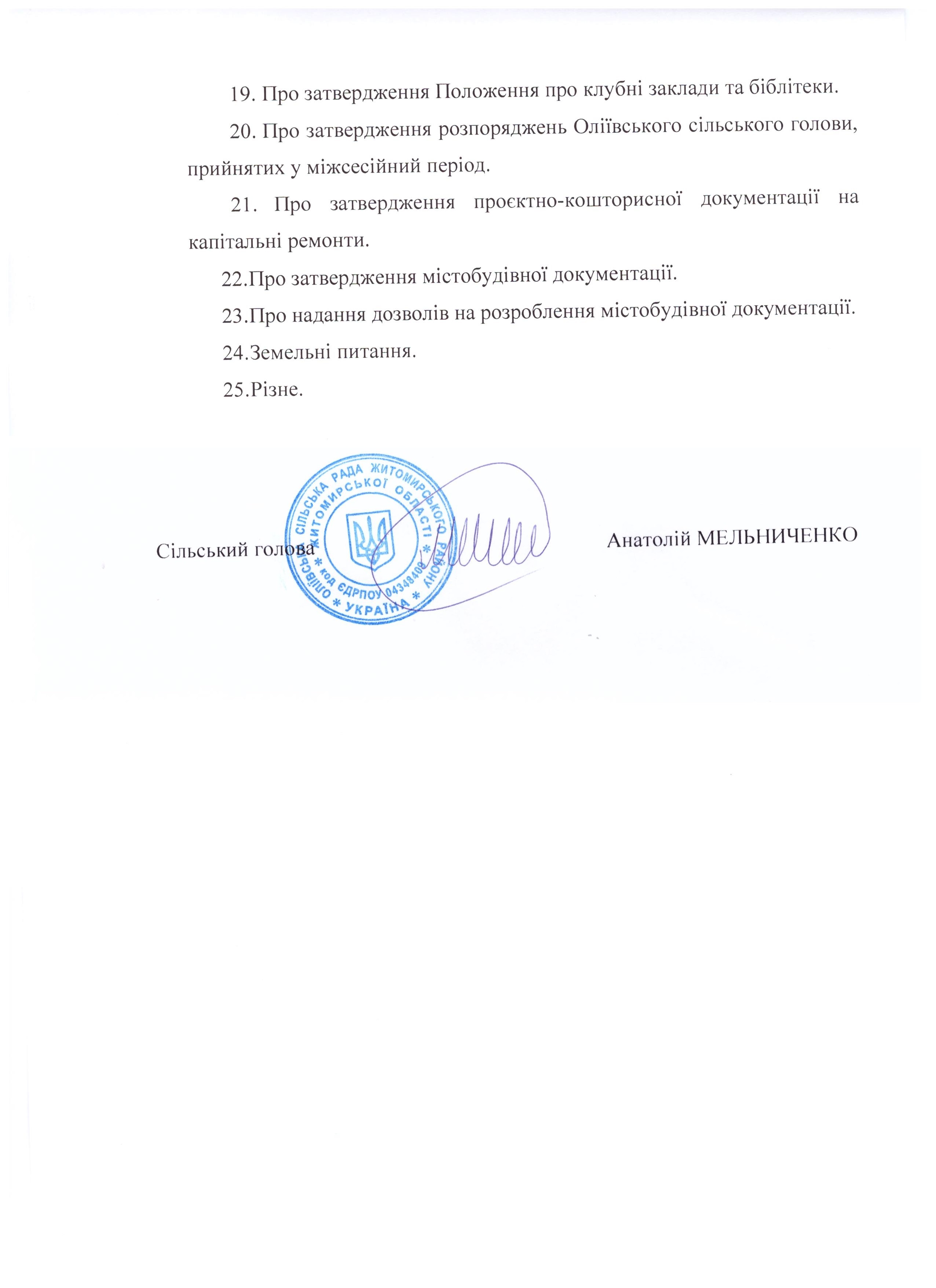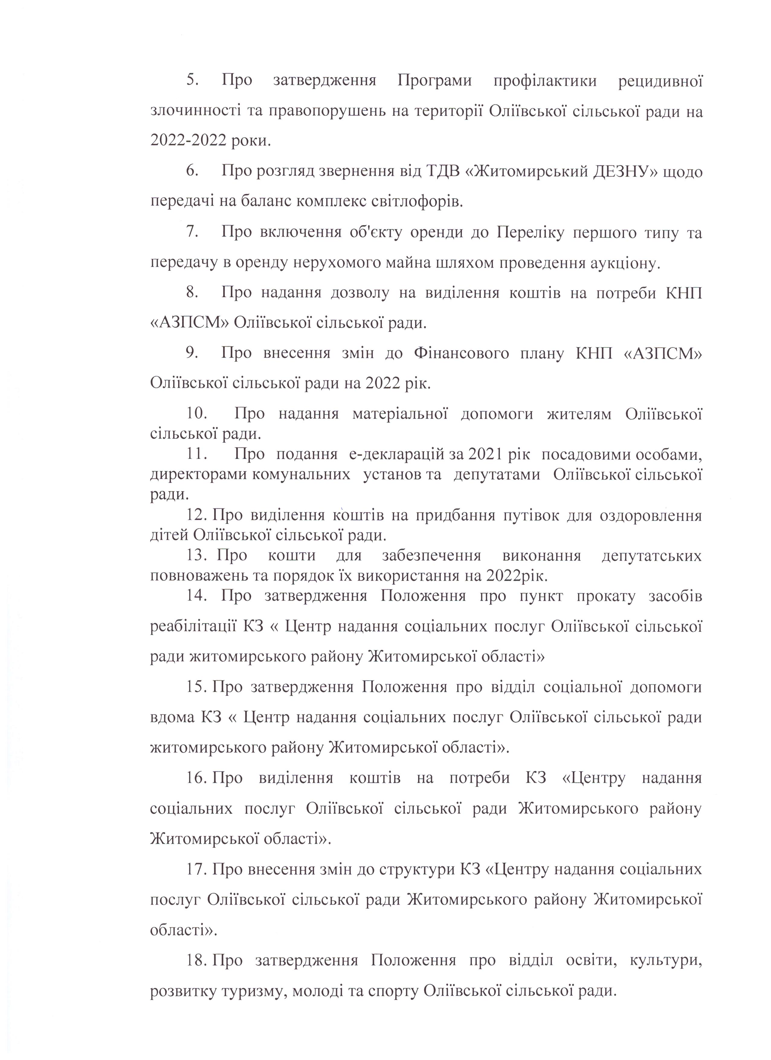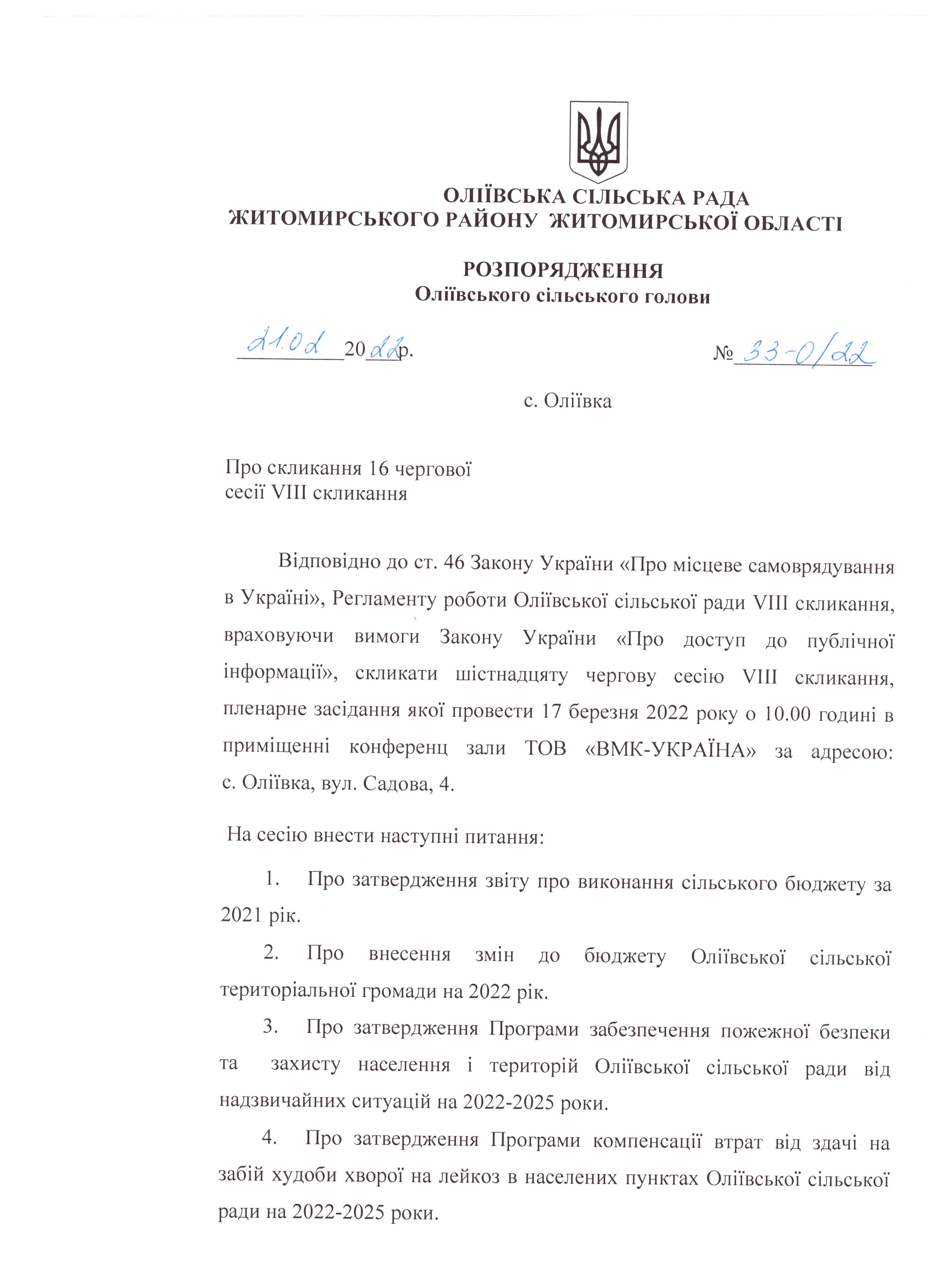 Розпорядженням Оліївського сільського голови від 21.02.2022р. № 33-0/22, відповідно до ст. 46 Закону України «Про місцеве самоврядування в Україні», Регламенту роботи Оліївської сільської ради 8 скликання, враховуючи вимоги Закону України «Про доступ до публічної інформації», скликається шістнадцята сесія VIIІ скликання Оліївської сільської ради, пленарне засідання якої буде проведено 17 березня 2022 року о 10.00 в приміщенні конференц-зали ТОВ «ВМК-УКРАЇНА» за адресою: с.Оліївка, вул.Садова, 4