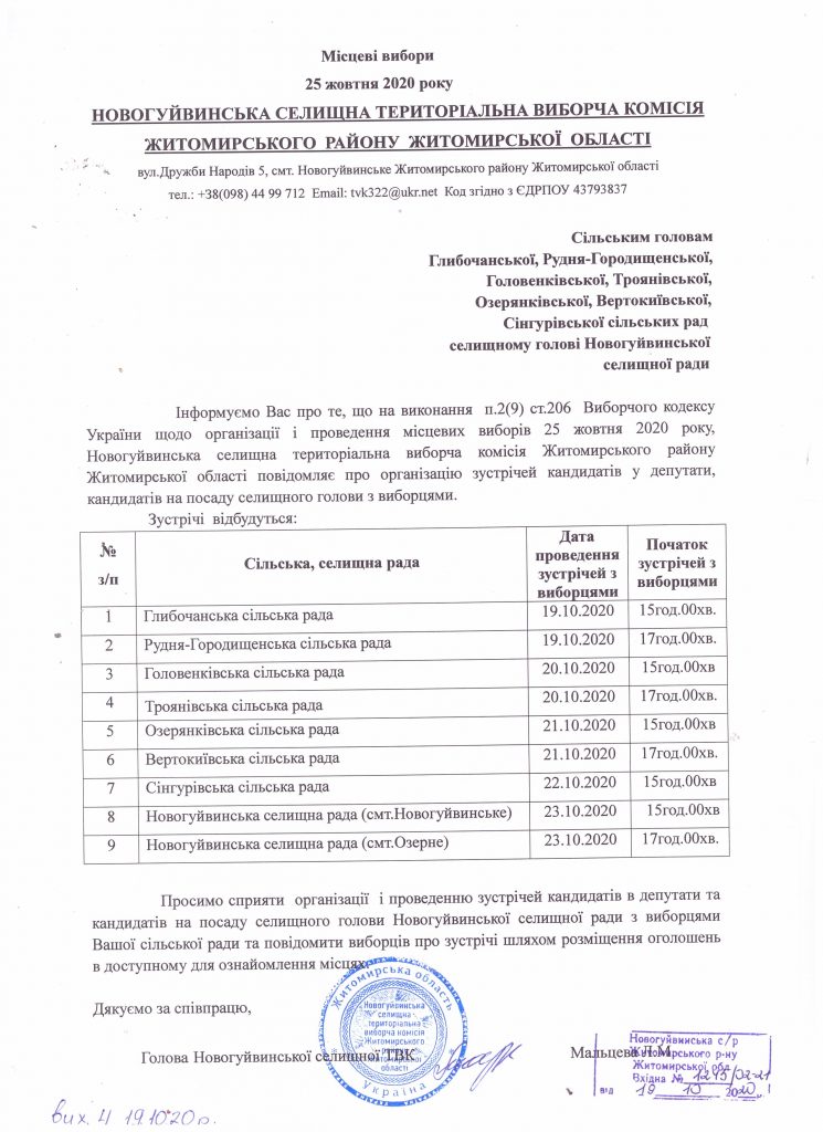 ОГОЛОШЕННЯ! Зустрічі кандидатів в депутати та кандидатів на посаду голови Новогуйвинської селищної ради з виборцями Новогуйвинської селищної ради відбудуться: 23.10.2020р. о 15.00 – смт.…
