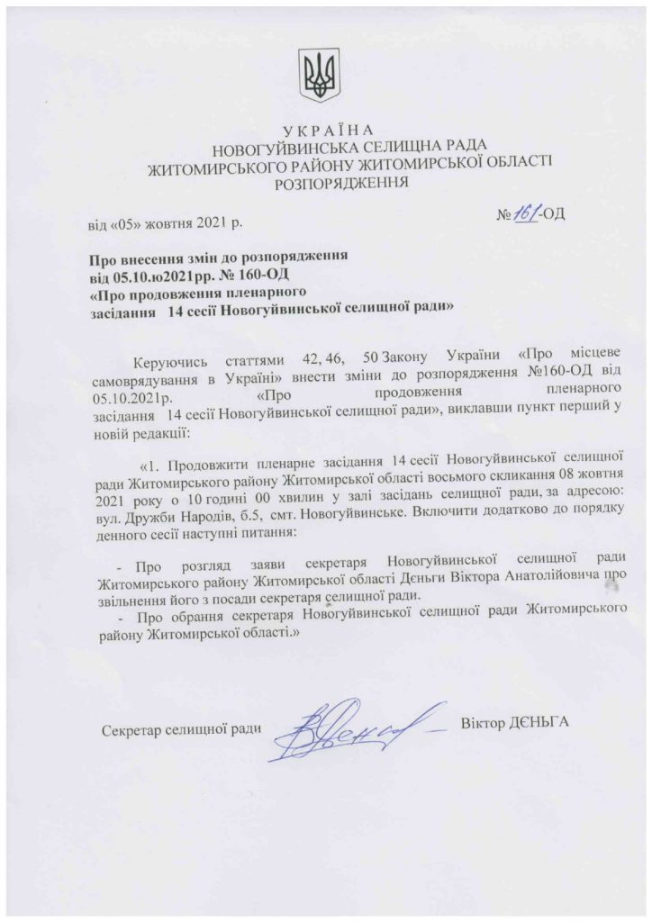 У К Р А Ї Н А НОВОГУЙВИНСЬКА СЕЛИЩНА РАДА ЖИТОМИРСЬКОГО РАЙОНУ ЖИТОМИРСЬКОЇ ОБЛАСТІ РОЗПОРЯДЖЕННЯ від «05» жовтня 2021 р. …