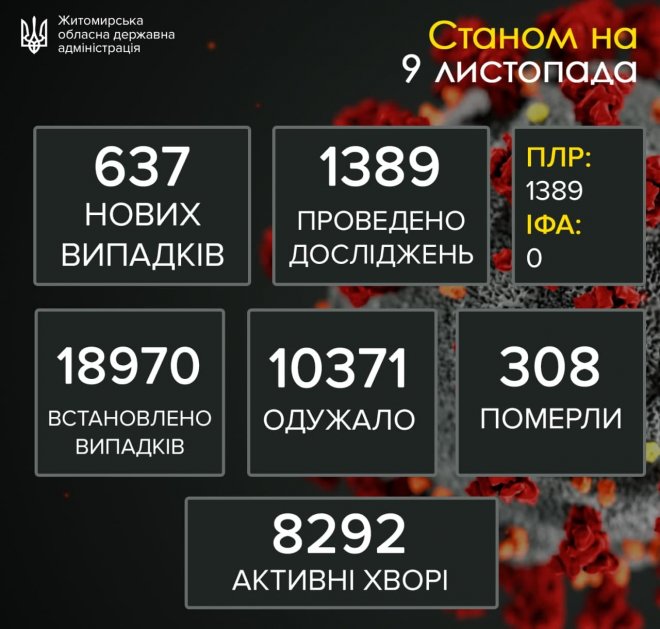 Як повідомляє телеграм-канал Житомирської ОДА “Коронавірус_Житомирщина”, станом на 9:00 9листопада 2020 року, за результатами лабораторного дослідження 1389 проб, підтверджено хворобу у 637 жителів Житомирщини. Сумарна…