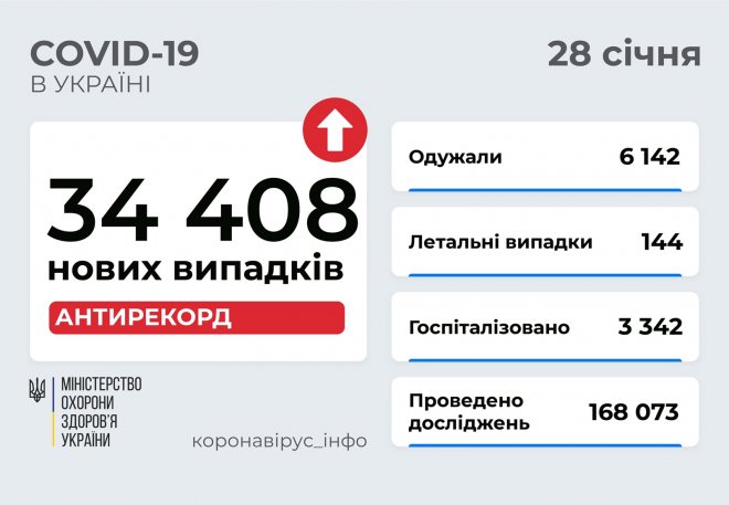 В Україні за минулу добу, 27 січня, виявили 34 408 нових випадків коронавірусної хвороби COVID-19.Про це повідомляє Міністерство охорони здоров’я у Фейсбуці. “За добу 27…