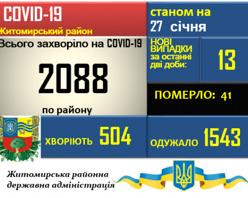 За період спостереження (з квітня 2020 року), станом на 27 січня 2021 року, у Житомирському районі (у старих межах) зафіксовано 2088 випадків захворювання на коронавірусну…