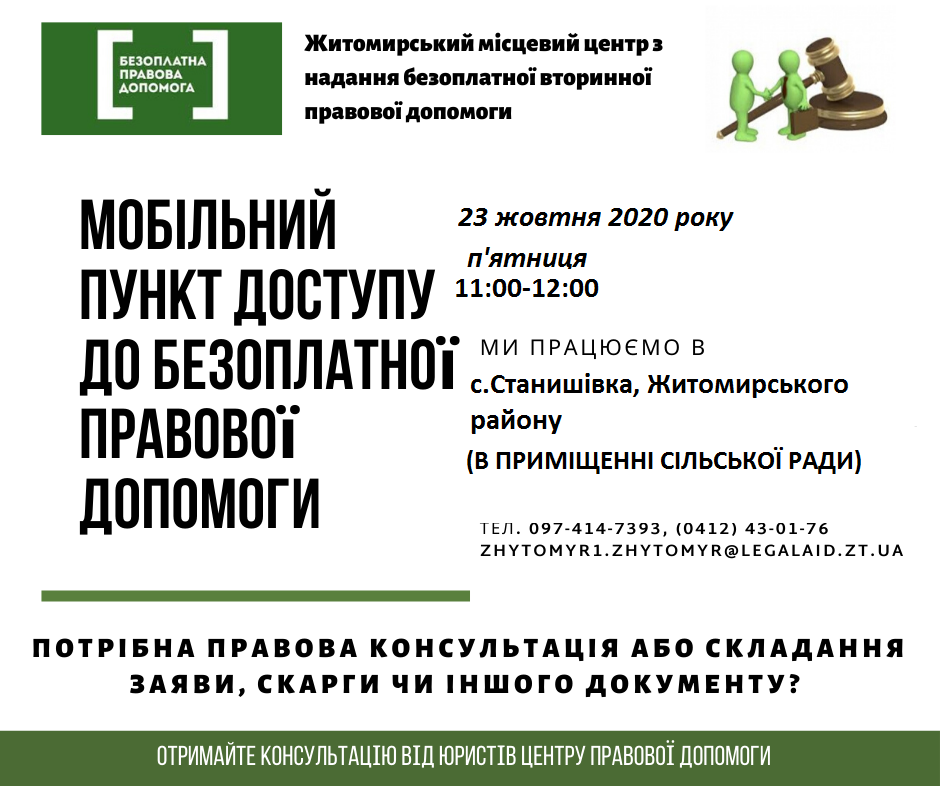 23 жовтня 2020 року з 11-00 до 12-00, в приміщені Станишівської сільської ради, за адресою с. Станишівка вул. Кооперативна 3, відбудеться виїзний прийом спеціалістами Житомирського місцевого…