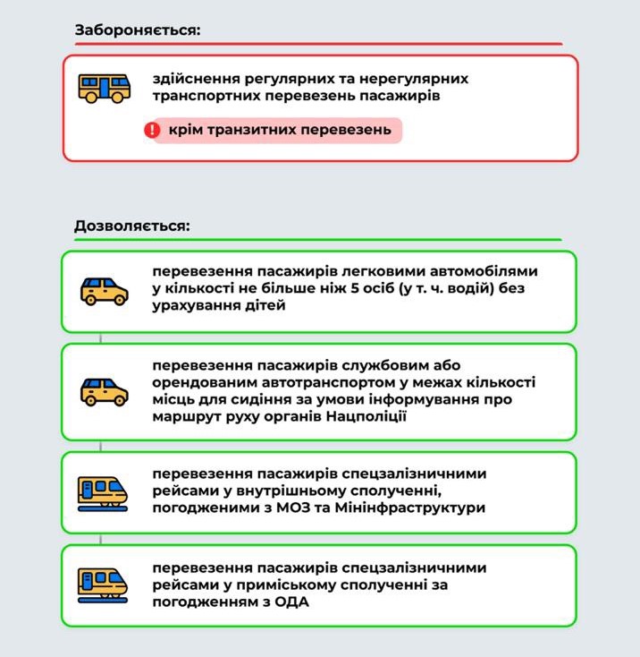 Нові обмеження стосуються роботи громадського транспорту. Забороняється здійснення регулярних та нерегулярних транспортних перевезень пасажирів (крім транзитних перевезень). Водночас під обмеження не потрапляють перевезення пасажирів легковими…