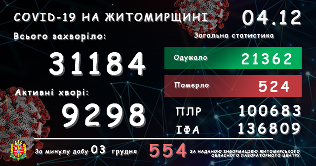 За період спостереження (з квітня 2020 року), станом на 07 грудня, у Житомирському районі зафіксовано 1752 випадки захворювання на коронавірусну хворобу COVID-19. З яких 165…