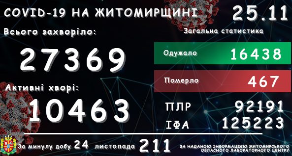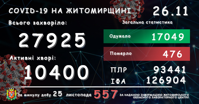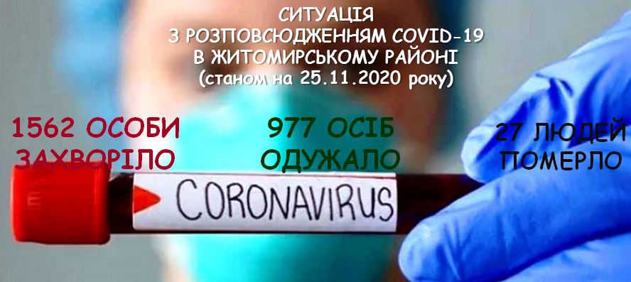 За період спостереження (з квітня 2020 року), станом на 25 листопада, у Житомирському районі зафіксовано 1562 випадків захворювання на коронавірусну хворобу COVID-19. З яких 147…