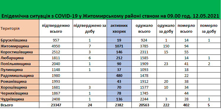 Станом на ранок 12 травня у Житомирському районі зафіксовано 402 летальних випадки від ускладнень, викликаних коронавірусною хворобою. За останню добу маємо 5 нових випадків –…