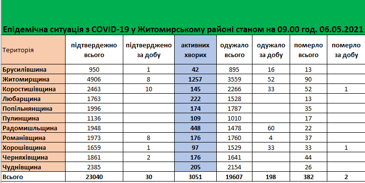 Станом на ранок 06 травня у Житомирському районі зафіксовано 382 летальних випадків від ускладнень, викликаних коронавірусною хворобою. За останню добу маємо 2 нових випадки –…